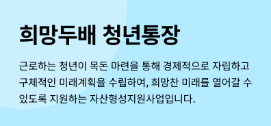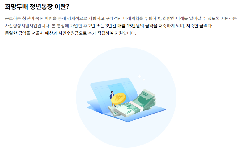 서울시가 운영하는 희망두배 청년통장은 일정 기준을 충족하는 근로 청년이 매달 일정 금액을 저축하면, 동일한 금액을 서울시에서 함께 적립해주는 자산형성 지원 프로그램입니다. 이렇게 형성된 자금은 만기 시 주거비, 결혼 자금, 교육비, 창업 자금 등으로 활용할 수 있습니다.