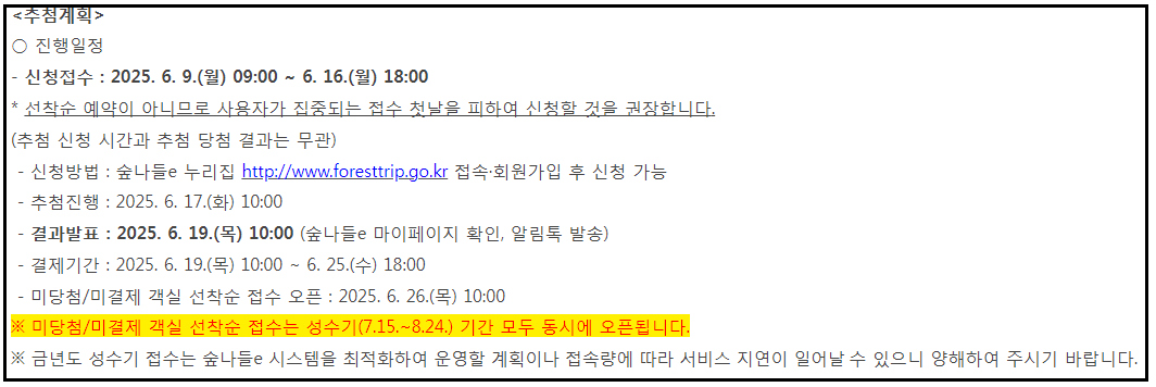 자연휴양림의 여름 성수기 기간은 7월 중순부터 8월 중순까지로, 이용객 수가 평소보다 수 배 이상 많습니다. 때문에 대부분의 인기 숙소는 조기 마감되며, 접수 개시 직후 1~2분 안에 예약이 완료되는 경우도 흔합니다. 이에 따라, 사전 준비가 매우 중요합니다.
