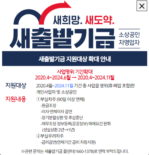 × 새출발기금 신청 유의사항 새출발기금 제도 안내 ’20. 4월~ ’24. 11월 중 사업을 영위한 개인사업자 또는 법인 소상공인이 보유한 금융권 대출에 대해 새출발기금 신청을 통해 상환기간은 늘